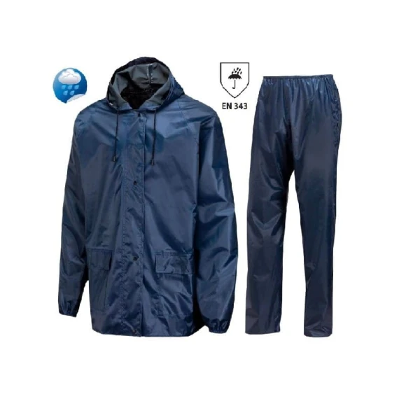 Costum impermeabil din poliester/pvc alcatuit din jacheta si pantaloni. Jacheta este cu gluga pliabila, inchidere frontala cu fermoar si mansete elastice. Pantalonii au elastic in talie si inchidere cu capse la glezne.