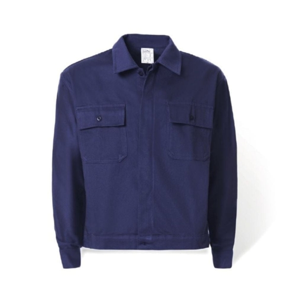 Jacheta de lucru pentru bărbați din bumbac sanforizat, cu guler tip camasa si cusaturi contrastante. Inchiderea frontala cu  nasturi acoperiti cu fenta si echipata cu doua buzunare la piept inchise cu nasturi si clapeta. Manseta din material inchisa cu nasturi.