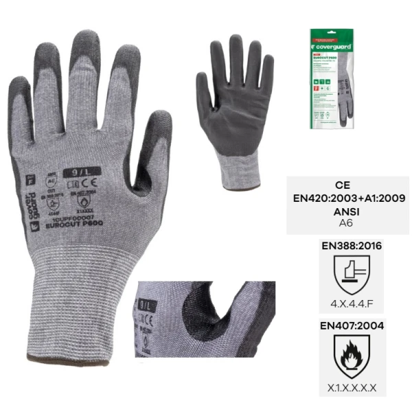 Manusi de protectie cu rezistenta la taiere F, protectie la temperatura 100°C pentru 15 sec, EUROCUT P600, gri, imersie PU, EN 388 : 4X44F, 10 perechi/pachet, Coverguard