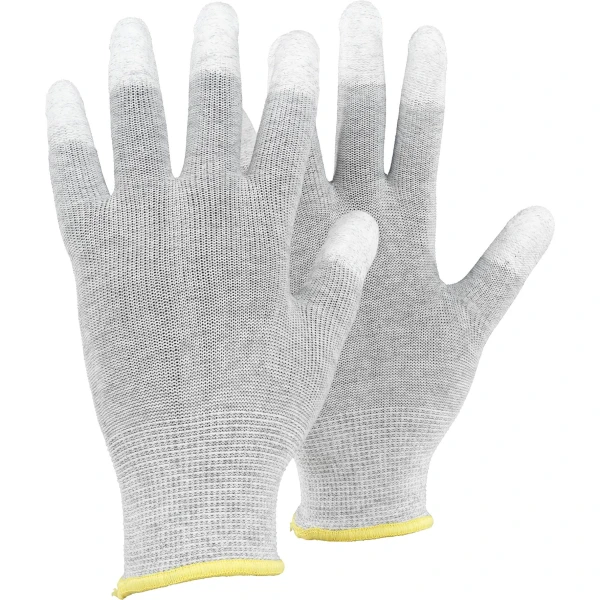 Mănuși standard, pentru protecție ESD. Moi, netede și foarte respirabile. Fibre de 13 gg, pentru asigurarea confortului pe tot parcursul zilei. Vârfurile degetelor impregnate cu PU, pentru priză maximă. Fabricate din materiale flexibile, pentru dexteritate și sensibilitate la vârful degetelor.