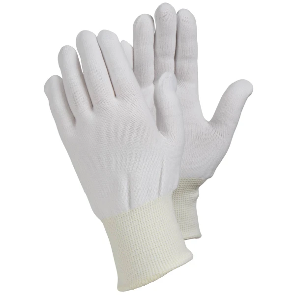 Mănușă din material textil moale, confortabilă și respirabilă, mai lejeră la încheietură, datorită marginii rulate a manșetei. Realizată din nailon 13 gg, dublu tricotat, fără cusături. Strânsă, sensibilitate bună la vârfurile degetelor. Reduce riscul de contaminare, amprente și zgârieturi pe suprafețele sensibile. Perfectă pentru lucrări de asamblare fină și de inspectare în medii uscate. Aprobată pentru manipularea alimentelor.