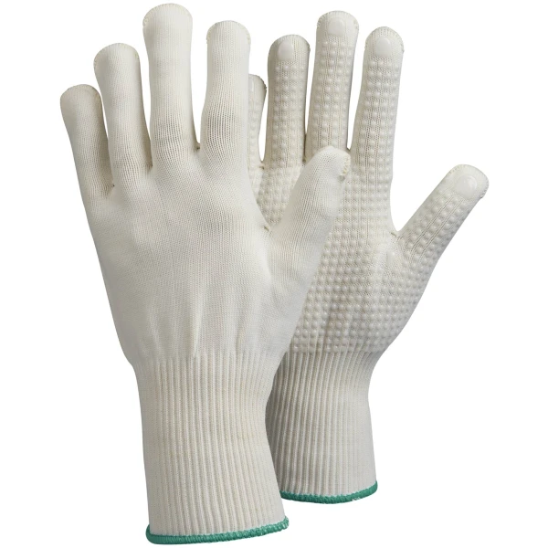 Mănușă textilă moale și confortabilă, albă, cu puncte din vinil fără ftalați, transparente. Realizată din nailon 13 gg și bumbac, dublu tricotat, fără cusături. Priză și potrivire excelente și sensibilitate la vârful degetelor. Respirabilitate maximă, perfectă ca alternativă dacă o mănușă impregnată este prea călduroasă. Potrivită pentru lucrări versatile în medii uscate. Rezistă la căldură de contact de până la 100 °C și este aprobată alimentar.