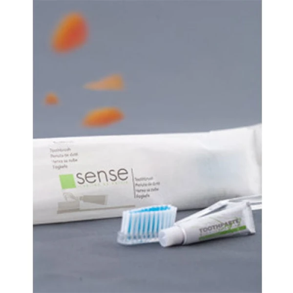 Setul dentar Sense contine: periuta de dinti, tub pasta de dinti 5gr.Este accessoriul esential pe care il vor folosi clientii hotelului dumneavoastra cu incredere in timpul sejurului. Ambalajul este biodegradabil si reciclabil, din hartie cerata. Setul dentar pentru hotel apartinand gamei Sense este un accesoriu care nu trebuie sa lipseasca dintr-o baie de hotel respectabila.